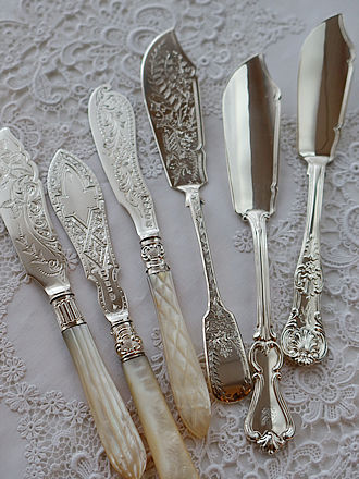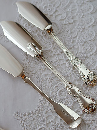 ヴィクトリアンスターリングシルバーの弓なりシェープにスイカ ズラやアイビーをナイフブレードに浮き上がらせたマザーオブ パールハンドルの長さ195mmのバターナイフを ロイヤルウースターのプレートに重ねスコーンとともにクリーム ティータイムはいかがですか。 ナイフブレードをフラットに仕上げていますのでクロテッドクリームを すーっとスコーンに重ねられる虹色のマザーオブパールが美しい ロンドン1897年WilliamHutton&SonsLtdの バターナイフです。 右隣りのヴィクトリアンスターリングシルバーのバターナイフも 中世の剣のように先端のポイントが鋭く鋭利ではございませんが 左右に広がるラインはプチサーバーとしても重宝なブレードです。 シェフィールド1870年WilliamHutton&Sonsの緻密なエングレー ヴィング装飾が実に見事に仕上げられています。
