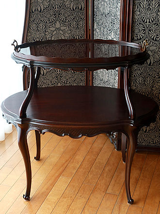 マホガニー素材のTrayTopTableでティーパーティーを 催しませんか。 両サイドに持ち手のついたグラストレーを重ねたオーバル シェープを二段仕上げにしたテーブルです。 トップのグラス面仕上げのテーブル面の縁取りをぐるり立ち上げ 左右の持ち手を支えるマホガニーの補強部分までナチュラルに 仕上げています。 その上下のテーブル面サイズを変えながら曲線ライン仕上げの 4本のフットが エレガントに支えています。 ダムウエイターのテーブルは円形からスクエアなど中心となります 中心棒が真ん中に添えられていますので自然とセッティングも その周りを囲むように並べます。 こちらのトレートップテーブルは上下のサイズ差はございますが しっかりとオーバル状のテーブルにお茶の道具諸々 アペリティフを準備するドリンクグラス&クラレットジャグやプレート テーブルカトラリーなどを上下の空間スペースに自由自在に アレンジできます重宝なTrayTopTableです。