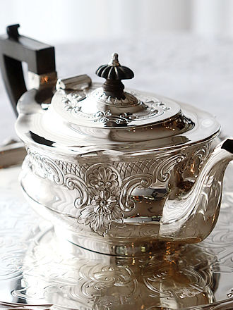 ヴィクトリアンスターリングシルバーの安定感のあるティ―ポットに ミルクのシャープな注ぎ口と焼き菓子入れにも似合うシュガー ボウルを揃えたティーサーヴィスセットの詳細画像を撮り終え次第 ご紹介します ロンドン1898年HoraceWoodward&CoLtdです。 上蓋からボディ、さらに注ぎ口へとアカンサス葉の凹凸紋様に低めに 仕上げた4本のフットで安定感を支えています。 低めのスタイルは注ぎ方がとてもスムーズです。