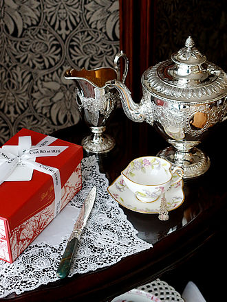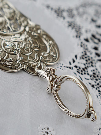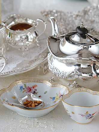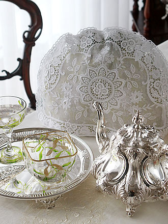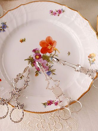 スターリングシルバーのシェフィールド1935年ThomasBradburry& SonsLtdのクランベリーグラスバスケットにクロテッドクリームor フレッシュジャムを用意しマイセンのインドの華ピンクローズシリーズの ケーキプレートで午後のお茶時間にティーセッティングです。 スコーンを保温するホワイトリネンにレースの縁取りを飾り愛らしい ワンポイント刺繍を施したスコーンホルダーに出会いました。 トップ部分に細工されたスナップボタンをパチン&パチンと重ねますと ふんわり広がる部分にひとつひとつスコーンをおさめられる可愛らしい バスケット形状仕上げです。 午後のティータイムにスコーンやマフィン等々ヴィクトリアン スターリングシルバーのバーミンガム1891年Hilliard&Thomasonの スコップ型ボウルと刃先が四本刃のフォークでジャムスプーンor プチサーヴィングに合わせます。 マザーオブパールハンドルの短めサーヴィングカトラリーはお茶時間に 重宝なサーヴィングセットです。 マザーオブパールハンドルの美しい輝きを保つバーミンガム1881年 Hilliard&Thomasonがマイセンのケーキプレートに程よいサイズです。