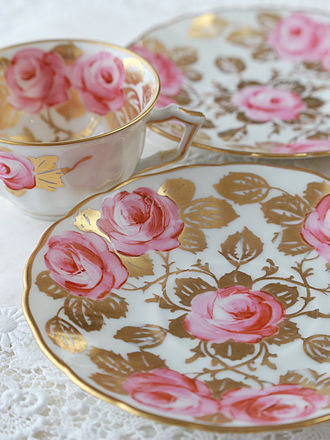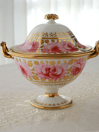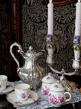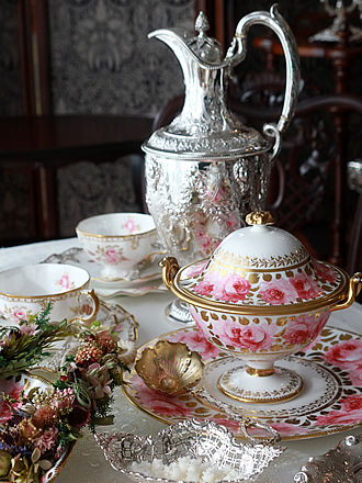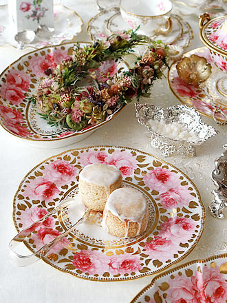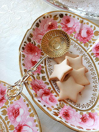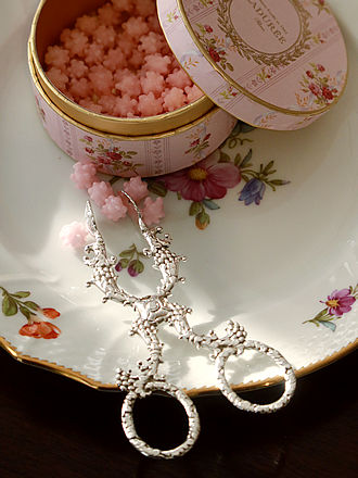 9月も末となり近郊の山々もフレッシュなグリーンから紅葉へと 秋めいてきました。 先週のエリザベート皇妃が愛したウィーンの午後のお茶に ご紹介しましたウエルカムドリンクにスミレの砂糖菓子一粒で 瞬く間にグラスに映る色合いが美しいスミレのドリンクに変化する 様子に感激していただきました。 デメルのKANDUERTE VEILCHEN スミレの砂糖菓子を エリザベート皇妃が戦地で負傷した兵士達の 慰問に一人一人に 配られたと伝えられるお砂糖菓子です。 当時の風習から想像する貴重なお砂糖菓子は治療を受ける兵士たちに とって皇妃の思いやりに感激されていたことでしょう。 縁取りをレースのように透かしピンクローズのブーケ紋様を描きました ドレスデンのプチコンポートに飾ります。