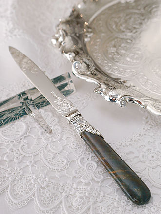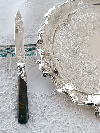 スポンジ系のケーキ地やサクサク生地のタルトなど切り分けに 合わせていただきたい長さ217mmのAgateハンドルを合わせた シェフィールド1892年JohnRound&SonLtdのサーヴィング ナイフです。 グリップを握る際の程よいAgeteの厚みとブレードのしっかり全体に厚みを と強度を考えたバランスが切れ味の良さを考慮しています。 さらにナイフブレードを飾る両面に飾られたトップからハンドルとの接合部分 までの華麗なエングレーヴィング彩が彫り深くきらきらと輝いています。 ハンドルに目が留まりますブレードとの繋ぎ目を繋げるアカンサス葉の 鋳造仕上げも力を加える時に程よく指に触れる感覚が心地よいです。