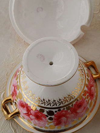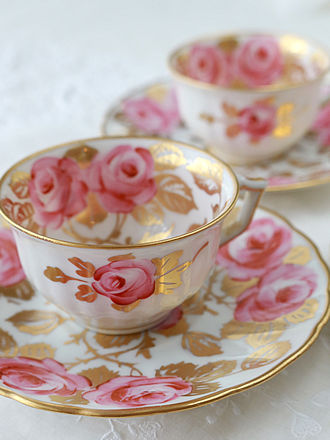 英国コールポート窯のジョン・ローズ期に仕上げた特徴的な ティーカップ&ソーサーをご紹介します。 それぞれ英国の美しい薔薇をはじめとしたガーデンフラワーを描いた ナチュラルな絵付けです。 ティーカップの形状はもちろんのこと、ハンドルのスタイルも くるりと巻き上げた愛らしいスタイルやオールドイングリッシュ ハンドルと呼ばれるシャープなラインをご紹介します。 C.1820年頃の英国コールポート窯のティーカップ&ソーサーです。 ティーカップの口元&ソーサーの縁取りをガドルーン金彩紋様で 飾られたペングローブシェープに優雅で繊細なループハンドルが 魅力的です。 英国のガーデンフラワーを窓紋様に描き金彩ロカイユ紋様で飾られた ソーサーにティーカップの内側にも金彩リーフガーランドが白磁に 引き立っています。