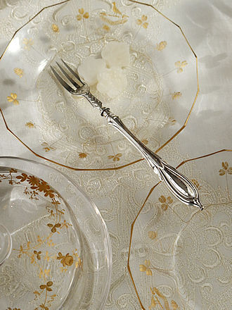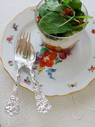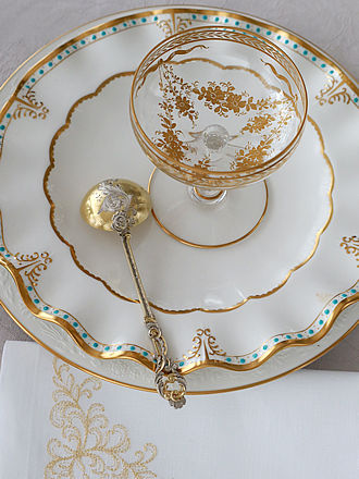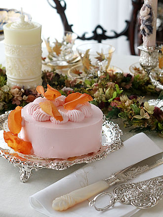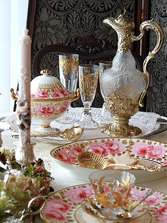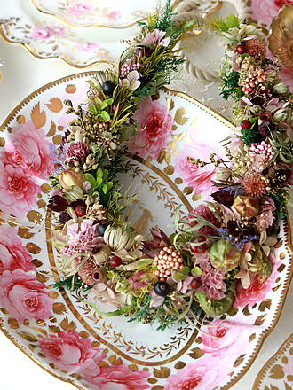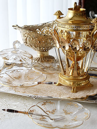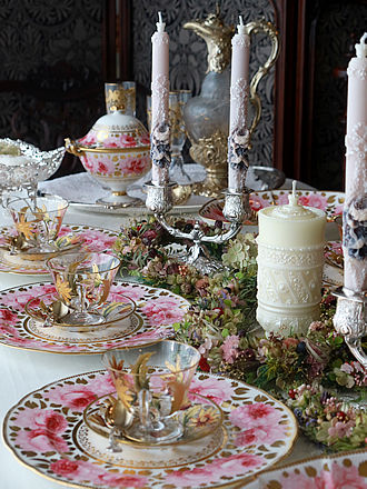 英国ダヴェンポートの二連薔薇でキャンドルアレンジです。 フレンチシルバーのクラレットジャグに合わせたサンルイのゴールド エナメル彩の フルートグラスが美しいです。 低めのフィンランドシルバー830銀のペア・キャンデラブラをセンターに 馬蹄型形のおもりリースを重ね合わせ色遊びです。 ピンクローズとゴールドエナメル彩のグラス等々を合わせフランスから 届いたばかりのフレンチシルバーの5種類のサーヴィングセットが 揃えられましたボックスの中からダヴェンポート窯のオーバルプレートに 重ねます。
