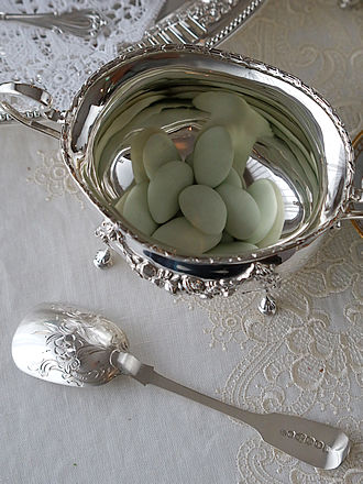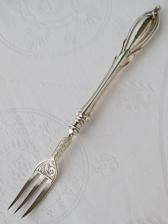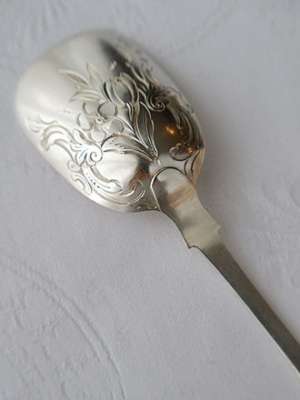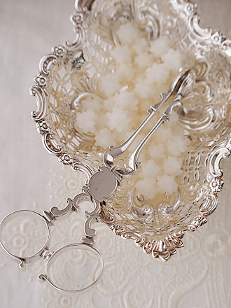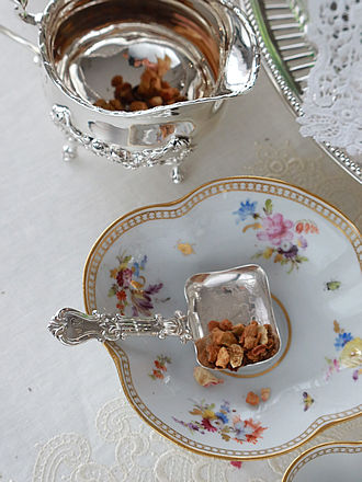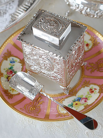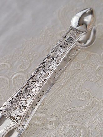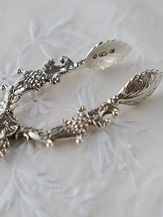 現代ではお砂糖を崇め奉る思いはすでに失せていると思いますが 1700年代から1800年代では誰もが手軽に手に入るどころか 王侯貴族とて貴重なお砂糖。 その風潮のなか、お砂糖を取り出す道具も色々なスタイルが残されて います。 特に鋏むという動作に徹したバネ式のシュガートングは鋏む動作に準じた 摘み部分の美しい装飾と鋏む動作をスムーズに出来ることを考えた指を掛ける ハンドルの美しいデザインを施したシュガートングが多々目にします。 ジョージU世が統治していた1750年頃にロンドンでホールマークを 申請したシルバースミスJamesShruderが仕上げた長さ137mm38gの シュガートング摘み部分には筋状のシェル紋様が程よい厚みで仕上げられ 持ち手には一輪の花が咲き誇る様子をハンドル全体に表現した物語を感じます。 右側のシュガートングにはAman+の重厚なレモンスコーンを取り分ける 時に添えたいジョージ三世の頃ロンドン1817年にホールマークを申請した 英国銀器の巨匠と褒めたたえられたPaulSrorrのシュガートングを添えて みました。 お砂糖と限らずショコラやシュトーレンを取り分けるサーヴィスに 最適です。
