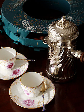 レースのように縁どられたマイセンのデザートプレートに幾種類もの フラワーブーケを窓紋様に重ねています。 ロカイユで囲われた三つの窓紋様とマイセンの白磁に浮き上がる花々が 金彩エナメル彩で丁寧に描かれた透かし紋様に華やかな彩りを加えています。 お花尽くしのお茶の時間に相応しいフラワーブーケシリーズです。 マイセンが得意とする繊細な花々は写実的な花紋様を専門に描く絵付け師達 により数週間から半年もの長い時間を費やされたマイセン独特の意匠です。