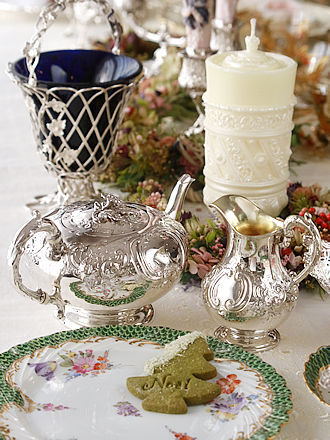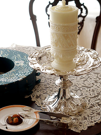 秋にオーダーさせていただいたクリスマスのフローラルキャンドルが 無事に届きました。 厳重に梱包されたボックスからずっしりとリース用のキャンドルを 取り出しスラリとしたヴィクトリアスターリングシルバー シェフィールド1899年Walker&Hallのデザートスタンドの中央に 重ねますとKOTETSUオリジナル?キャンドルスタンドの完成です。 クリスマスのテーブルセッティングに合わせてみましょうか。 さらにクリスマスまでのカランドリエ ド ラヴァン シニャチュール ノエルの 真円のカレンダーの 2→3→順不動に引き出しますと可愛らしいナッツ入り ショコラがひとつ入っていました。 美味しい紅茶とともにPaulStorrのシュガートングでいただきます。 ちなみに英国銀器の粋を極めたPaulStorrはロンドンのV&Aミュージアムに設けられた特別展示 スペースに飾られています。