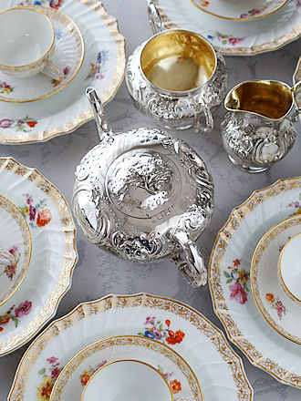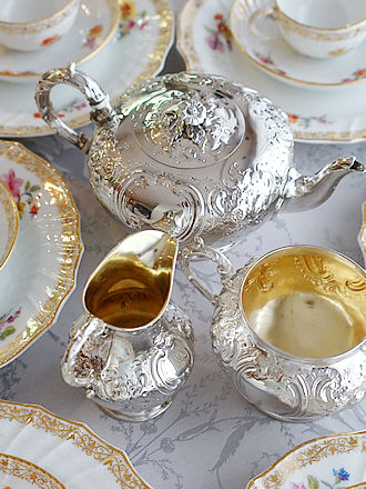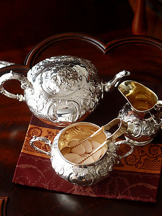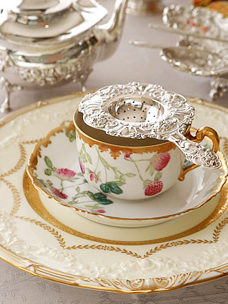 ティーカップに添えますティースプーンはハンドル装飾やボウルの ボリューム感などカップソーサーに似合うタイプを合わせるのもセッティング イメージの大切なポイントです。 ティーカップ&ソーサーの立体感あるデザインに合わせハンドルパターンを コブラパターンのネーミングのついたロンドン1883年FrancusHigginsIIIを 合わせました。