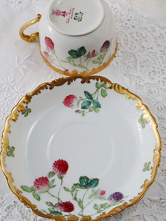 ドイツ北部ニーダーザクセン州の小さな街「フュルステンベルク」に 工房を設立したドイツ7大名窯のひとつフュルステンベルク窯の ティーカップ&ソーサーにケーキプレートが組み合わされたセットです。 フュルステンベルクでは1747年の設立以来、その時代時代の美意識や 生活様式を反映した磁器を製作し多角形のシェイプが美しいグレック(GRECQUE) スタイルとも言われますビーダーマイヤー様式のティーセットとして 1840〜1850年ごろにデザインされたスタイルをより曲線的に膨らみを持たせ 作られています。 ティーカップ&ソーサー&プレートセットには縁取りを金彩エナメル彩で飾り 曲線ライン状に薔薇を向き合わせたロココ調の金彩窓紋様の中に描かれています。 ハンドルのくるりと巻き上げたスクロールハンドルがとても愛らしい表情です。