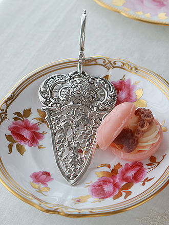 葡萄の透かし紋様をサーバーの先端から美しく模り手元側には 薔薇の花を盛り上げるように飾り、そのまわりをCスクロールで 囲うように仕上げたスェーデン830銀のケーキスライスです。 指を掛ける部分にも薔薇紋様をポイントにCスクロール&ロカイユで 丁寧に仕上げています。 小ぶりなタルト地やプチフールなどトングで挟むには形を崩してしまう というソフトな焼き菓子のサーヴィングに片手で自由自在に取り上げ られますので重宝なケーキスライスです。