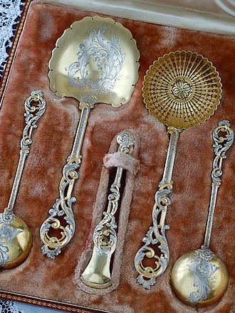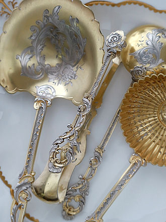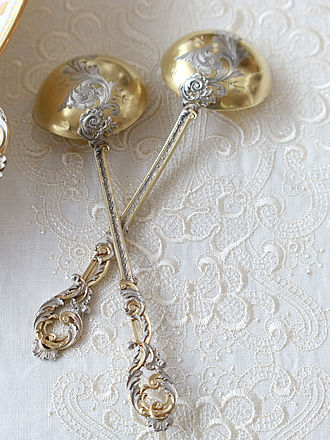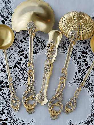 クリスマスを前に思わず「綺麗&素敵&ファンタスティック!」と 呟きましたフレンチシルバーのサーヴィングカトラリーセットが無事に 到着しました。 5種類のサーヴィングがボックスに納めされましたMinervaファースト銀の 輝きにヴェルメイユを施しハンドルのロカイユ装飾からサーヴィング部分の 表面&裏面を飾る緻密で美しい装飾技法は実際にお手に取られますと うっとりと眺めてしまうフランスのシルバースミスの美的センスです。 1890年頃にオーダーを受けたメゾンHenriSoufflot(1884-1910)が 手掛けましたサーヴィングカトラリーセットです。