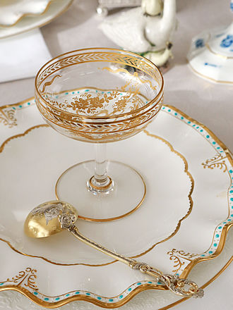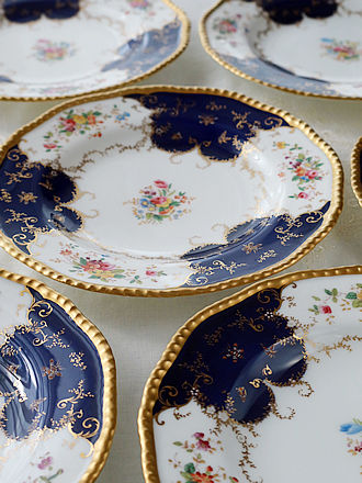 「エリザベート皇妃が愛した午後のお茶」興味深いハプスブルク家の 食卓文化を紐解くうえで皇帝フランツ・ヨーゼフ時代の 100人以上もの宮廷料人によるレシピのなかに材料と作り方を記した 「オリオ・スープ」が必ず記録に残されています。 しかも女帝マリア・テレジアのお気に入りの特別スープでありスタミナ源と 言われるスープとは?を「エリザベートが愛した午後のお茶」にお集まりの 皆様に ハンドカイザーやブレッシェルとともにお召し上がりいただきました。 口元を細く仕上げたモーゼルのグラスにはウエルカムドリンク そこのエリザベート皇妃がお好きだったスミレの砂糖菓子を一粒 少しづつ溶ける様に美しいブルーの水色が爽やかです。 ゲスト様の目を楽しんでいただいたParis窯のデザートセルヴィスセット パリ市内に館を持たれたとあるお屋敷から依頼を受けてパリ窯が届けた お花尽くしのボーダー紋様に美しいロイヤルブルーが輝いています。