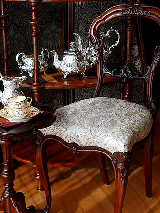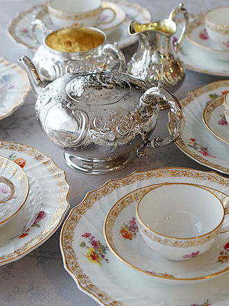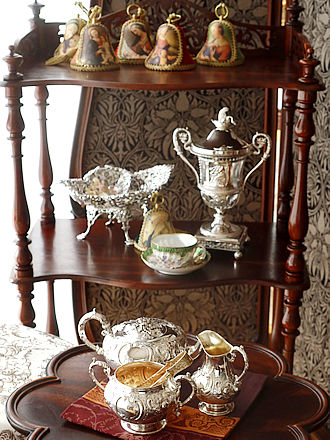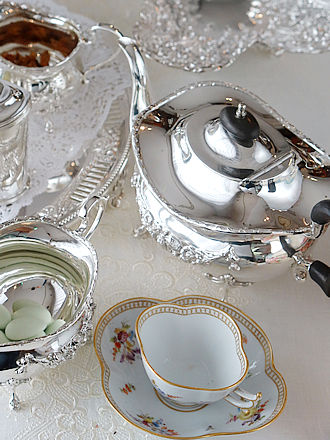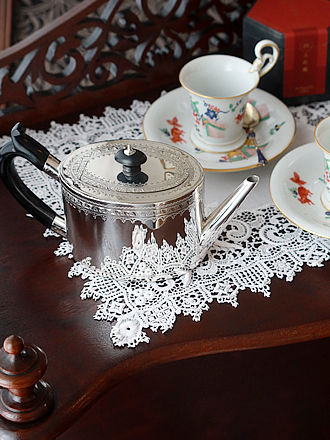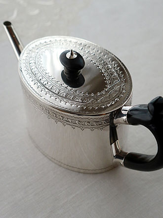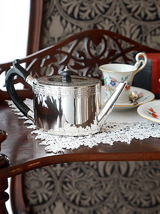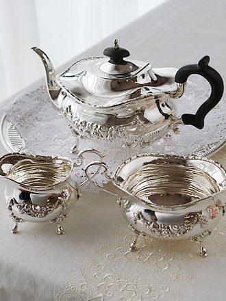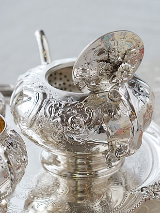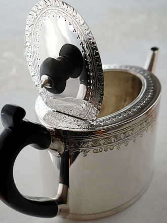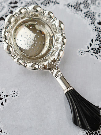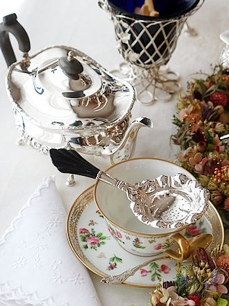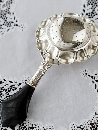 デンマークシルバー830銀のティーストレーナー シルバー工房Carl M.Cohr(1860-1925年) ティーカップに添えますとティーストレーナーのボウル部分を 縁取るフリル仕立ての凹凸紋様が程よく縁取りに重なり輝石で仕上げた ハンドルへとバランスよく合わせられます。 輝石を用いたハンドルには熱伝導を遮り持ち上げる際も安心です。 左画像に合わせましたティーポットはこれからご紹介します ヴィクトリアスターリングシルバーのティーポット&ミルクジャグ& シュガーボウルを合わせたセットです。 ボディを飾る薔薇のガーランド紋様がおしゃれです。