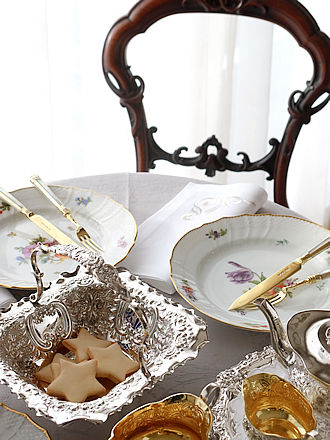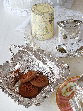 ホワイトリネンにリボンのモチーフをループ編みと刺繍で縁取られた スコーンホルダーに出会いました。 ホワイトリネンの程よい生地ざわりの中にスコーンを外側バスケットに 6個&内側にも6個を包み込む二重のバスケット構造でスコーンの 保温のために作られましたスコーンホルダーです。 トップの4個のフックを外しフラットにした大きさは直径300mmほどです。 花びら型のホワイトリネンの外側を包み込む部分にワンポイントの お花の刺繍が6か所チャームポイントのように飾られています。 こちらはMarcheページに詳細画像をご紹介しますので、構造&刺繍紋様を ご覧くださいませ。 錦秋のティータイムにマイセンのインドの華ピンクシリーズを合わせませんか。 デザートプレート6枚セットとローズピンクのフラワーブーケをそれぞれに 飾ったマイセンのC&Sを合わせられます様にCeramicページにご紹介します。 ちなみにティースプーンはフレンチシルバーのヌーボー調の可愛らしい ティースプーンがジャストサイズに素敵です。
