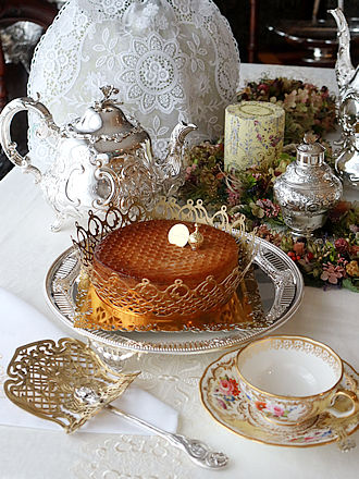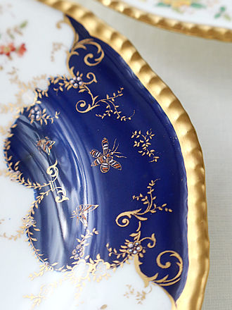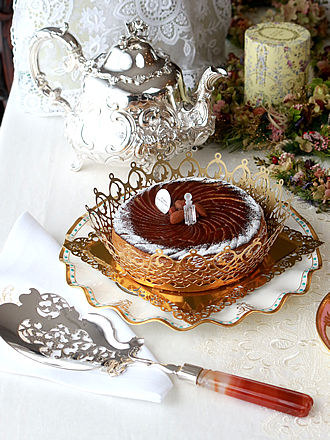 1月6日は「王様のお菓子」を意味するガレット・デ・ロワをいただく 公現祭ですが早々に年明けにアーモンドクリームのなチュールと 蜂蜜にアーモンドペーストと柚子のコンフィを入れたオレンジの 二層タイプの二種類を贅沢にも味わいました。 9月のイベントの時にお願いしましたCest.bo.er.Bonさんの 贅沢なガレットデロワに合わせた二つのシーンをご紹介します。 フェーブもトップにアレンジされキラキラです。 それぞれに似合うサーヴァーを合わせてみました。 英国古陶磁器のコールポート窯のトリオも見事なフラワーブーケ 紋様が浮き上がっています。