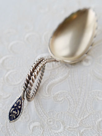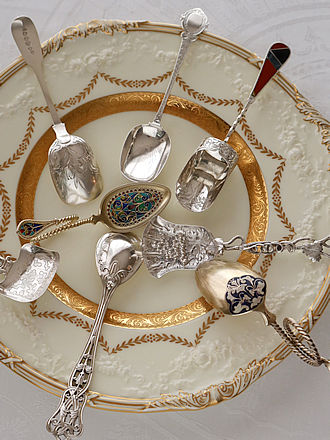 宝石のように煌めくエナメル装飾のスプーンやプリカジュールで 飾られたスプーン&輝石やギロッシュエナメル彩など スターリングシルバーでオーダーされたティーキャディスプーン& シュガースプーンです。 ひとつひとつ丁寧に仕上げたシルバースミス達は時代の流れと ともにオーダー主の趣向に合わせた繊細で特別なジュエリー装飾へ 販路を変えていきます。 プリカジュール&エマーユなど美しい宝石のようなスプーンです。