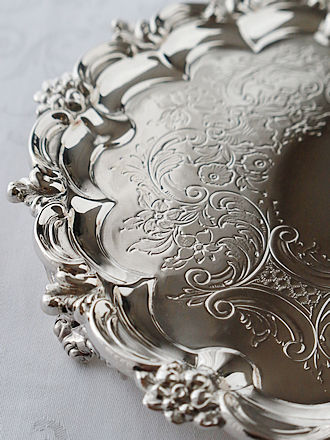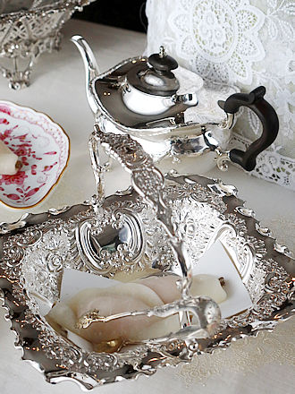 シェフィールド1901年MartinHall&Coが手掛けましたファンシー ケーキバスケットです。 花びら餅にもAMAM PLUSのキャラメルショコラを数枚重ねた スィーツアレンジなど色々楽しめるスクエアバスケットです。 ハンドルからバスケットの側面飾りのフリルを縁取った緻密な紋様には 薔薇をはじめとしたフローラル紋様が浮き上がっています。 さらに四方に飾られたCスクロール重ねも花々で可憐に飾られています。 フラット面が引き立つ鏡面仕上げがスィーツを輝かせてくれます。