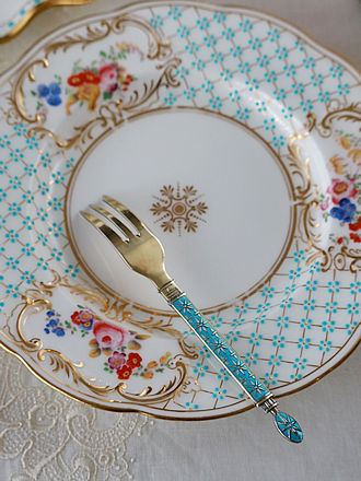 コバルトブルーのエナメル彩で飾られたノルウエイシルバーの プチサイズフォークです。 エナメル彩のカトラリーは出会った時に必ず手にしてますがコバルト ブルー地に丁寧に金彩を浮き上がらせた星型紋様が美しいです。 エナメル彩のみの細工とは異なりハンドルのボリューム感を感じます。 残念ながら1本のみのご紹介ですがミントンブルーのプレートにも 立体装飾のレースにも劣らず輝いています。