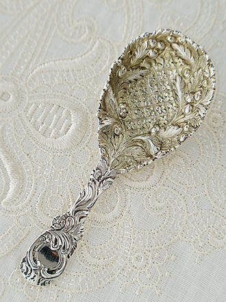 スコップ型のティーキャディスプーンを片手にお好きな茶葉を サクサクと取り出しませんか。 バーミンガム1896年WilliamDevenportの先端を愛らしい 花々のエングレーヴィングで飾りボウル部分の縁取りをフリルで 細工したスクリューハンドルのティーキャディスプーンです。 スコップ型と合わせヴィクトリアンスターリングシルバーの ティーキャディスプーンを幾つかご紹介します。